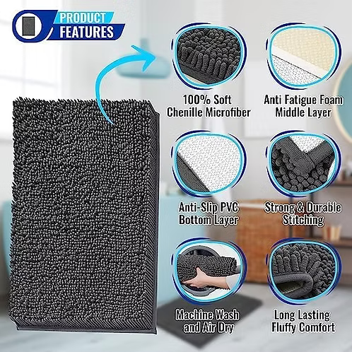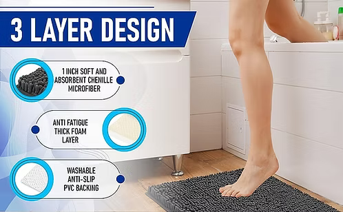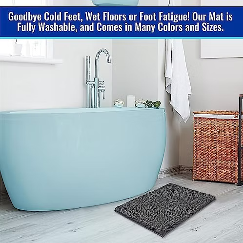 Our bathroom rug is made of 100% soft plush and fuzzy chenille microfiber for maximum pampering of your feet! We use the highest quality materials for long lasting use. No more cold and wet feet!
