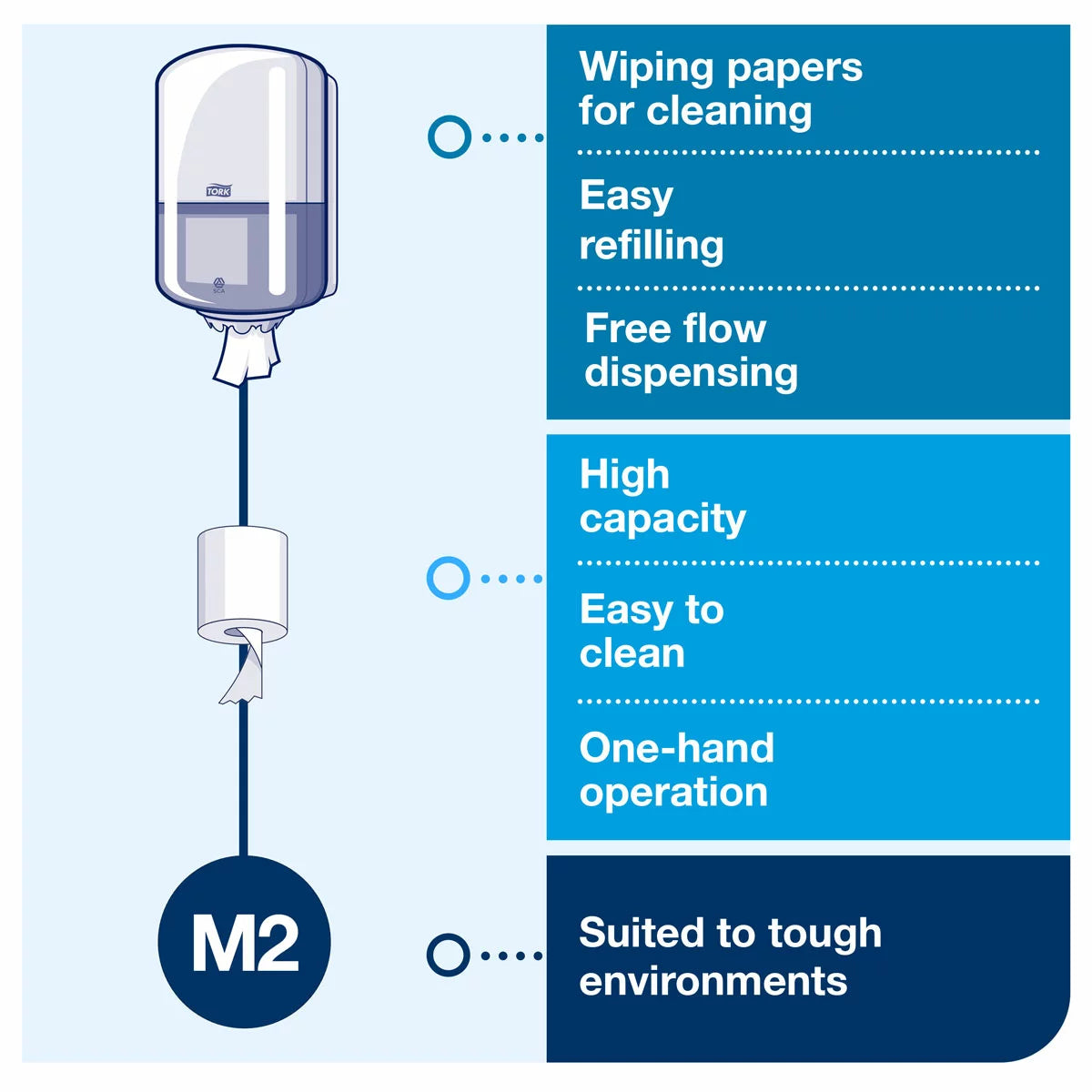The Tork Centrefeed Hand Towel Dispenser (M2 System) is suitable for environments where both hand and surface wiping are required. The attractive dispenser reduces consumption and waste with one-hand dispensing, allowing users the unrestricted flow to take as much as their tasks require. Tork Elevation dispensers have a functional, modern design that makes a lasting impression on your guests.