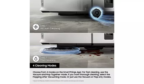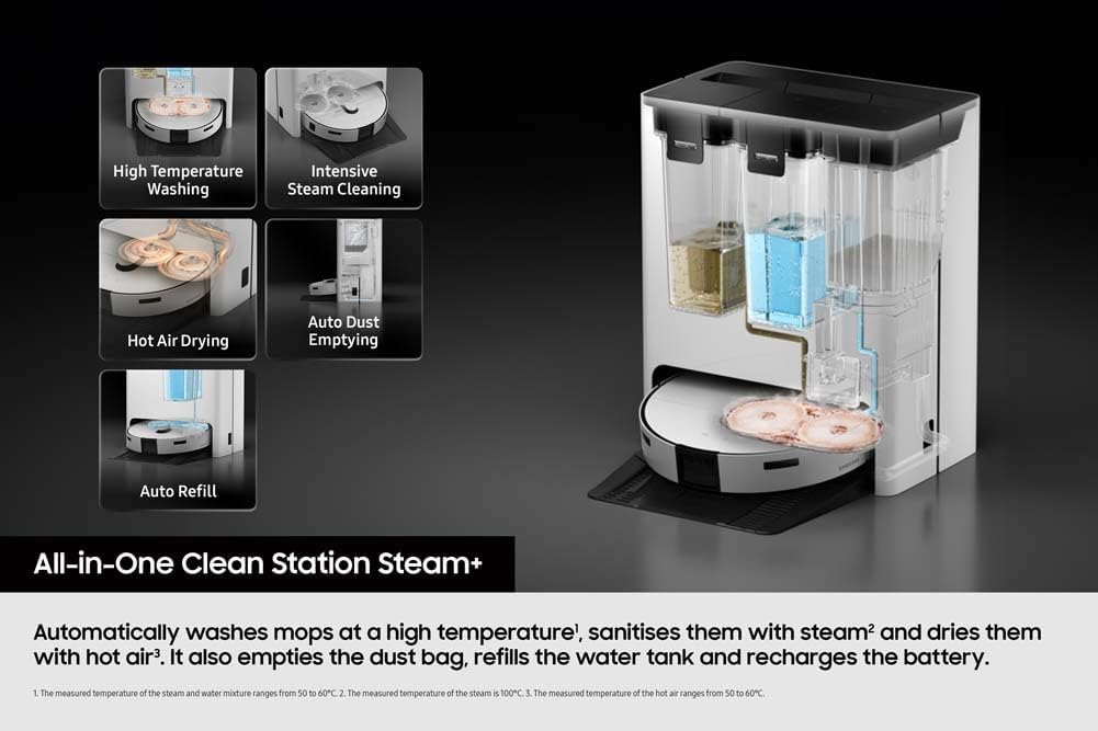 Clean your home effortlessly with a 3-in-1 cleaning solution. The Samsung Jet Bot Combo AI identifies different objects, stained areas and spaces, and can detect and avoid small objects, so it cleans carefully and thoroughly. The Clean Station Steam+ with Steam Sanitisation automatically washes and sanitises the mops and hygienically empties the dust bin. And its powerful mopping and cleaning removes dirt and hairs effectively and can be adjusted to suit the floor conditions.