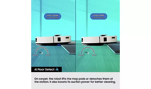 AI Floor Detect - Identifies different floor types. On carpet, the robot lifts the mop pads or detaches them at the station, to avoid cross contamination by the wet mops. It also boosts its suction power for better cleaning efficiency.