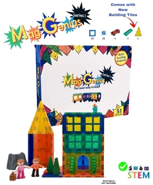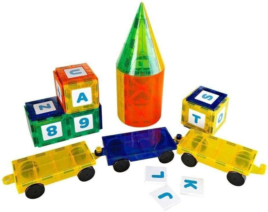 Expand your Mag-Genius world with this deluxe 51-piece starter or add on set, designed to boost creativity and unlock brand-new building possibilities. With specialty shapes like cylinders and cones for 4D creations, magnetic cars for vehicle builds, and a variety of hollow tiles and fun ABC/number click-ins, this set enhances any existing Mag-Genius collection. Bright transparent colors and high-quality materials ensure strong, safe, and imaginative play for the whole family.