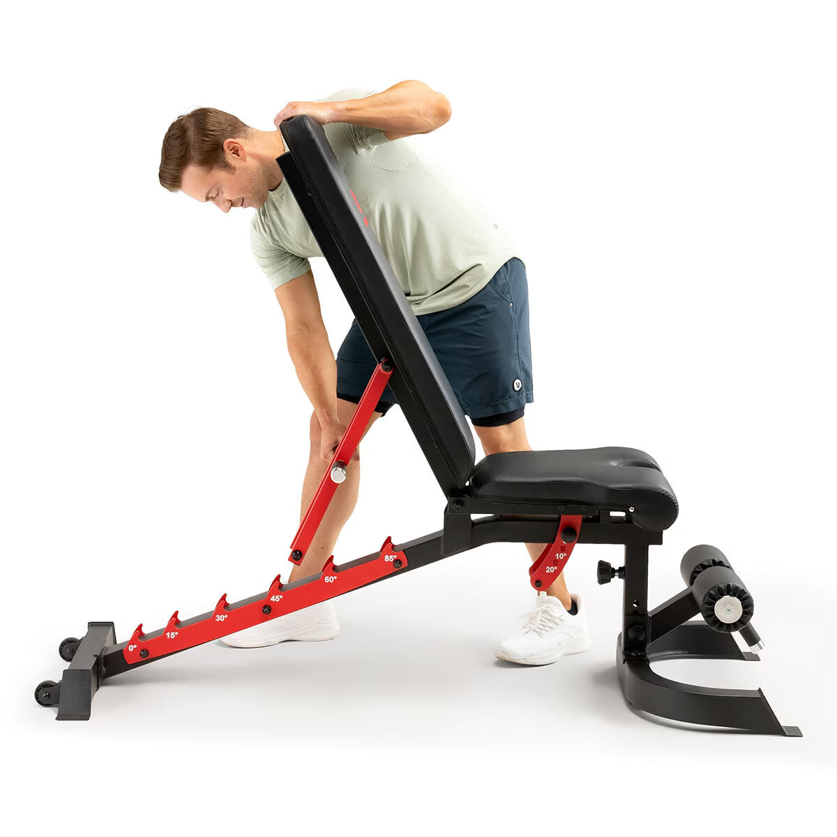 The Marcy SB-7799 Deluxe Utility Bench is perfect for anyone looking to work out every major muscle group with a single bench, and to tone and define their physique while burning calories to lose weight. It has a 7-position adjustable back rest with 2” thick Vinyl Boxed Upholstery with High-Density foam. The secure sawtooth adjustment design tilts from -22° to 85° the 3-postion seat pad tilts from 0° to 20°. The height-adjustable arm curl pad is excellent for training the peak of your biceps. The Marcy SB-7799 Deluxe Utility Bench is built with a durable heavy-duty steel tube frame with a black and red powder-coated finish, boxed upholstery with 2” thick high-density foam, and contoured foam roller ankle pads.