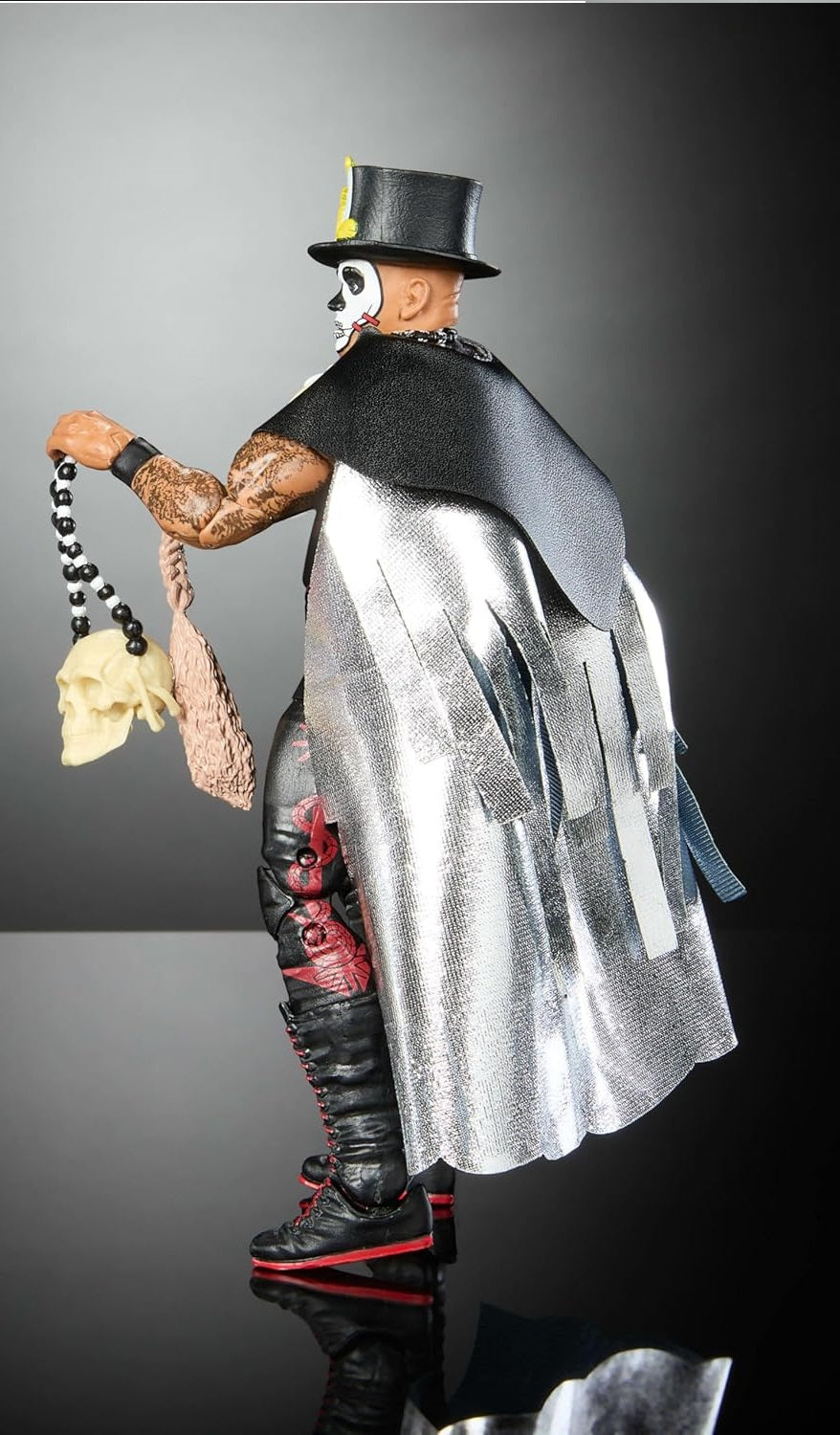 - Capturant sa présence inquiétante du début des années 90, cette figurine de 15 cm comprend trois têtes interchangeables avec des détails de crâne peints, ainsi qu'un haut-de-forme à plumes, un collier de crâne, une cape à franges et un bâton vaudou.