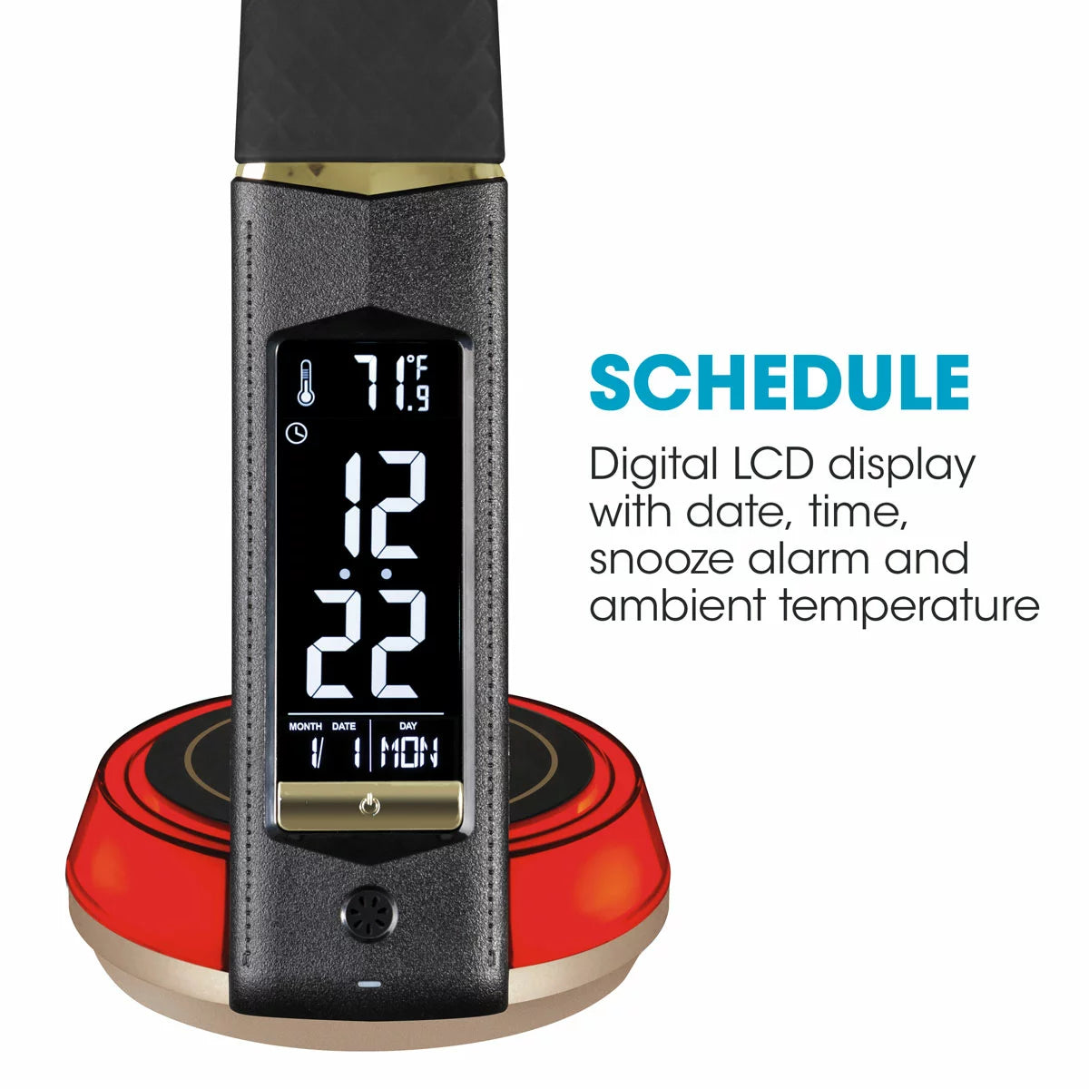 Rechargez simultanément deux appareils grâce au port USB 5 V, 2,1 A pour tablettes, écouteurs, enceintes et téléphones, et le chargeur sans fil Qi intégré à la base de la lampe pour les appareils compatibles. Consultez en un clin d'œil l'heure, la température, la date et le jour de la semaine sur l'écran numérique. Ce dernier intègre également une alarme avec fonction snooze. Personnalisez entièrement votre éclairage grâce aux commandes tactiles qui vous permettent de choisir parmi trois modes de couleur LED (blanc chaud, blanc froid et lumière naturelle ClearSun®) et trois niveaux de luminosité. La base s'illumine de la couleur de votre choix ou fait défiler en continu tout le spectre lumineux. Élégante et fonctionnelle, cette lampe est dotée de finitions métalliques et d'un col flexible en caoutchouc à motif diamant texturé.