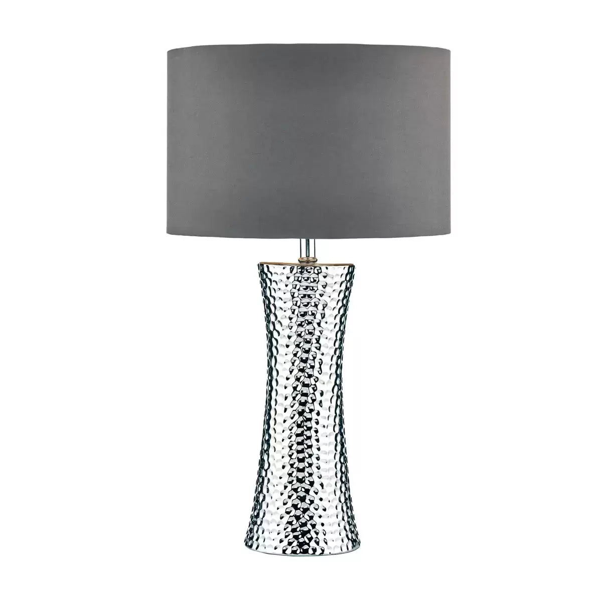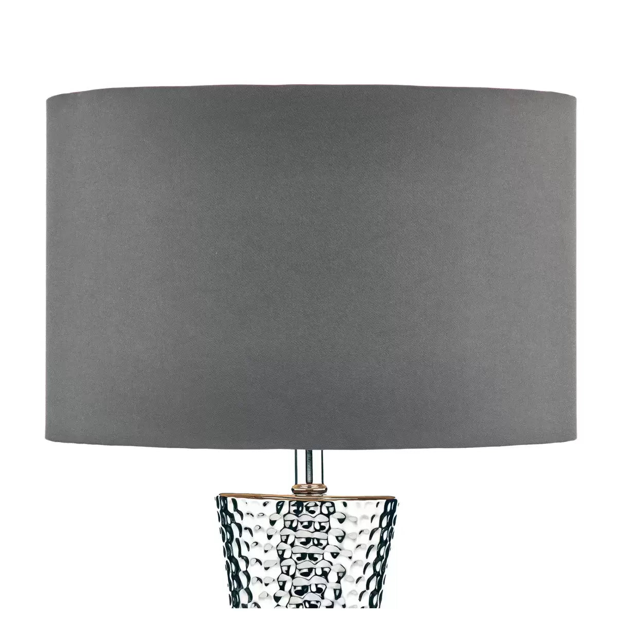 The Bokora table lamp features a hammered silver metal finish base and comes complete with a grey satin drum shade with grey lining. The table lamp is in line rocker switched.