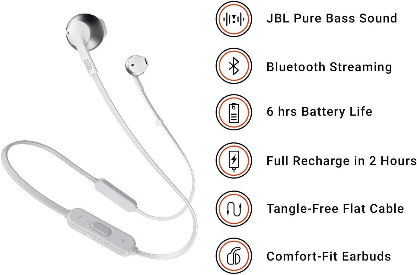 - In-ear headphones with microphone and case deliver rich, robust sound via JBL Pure Bass technology.