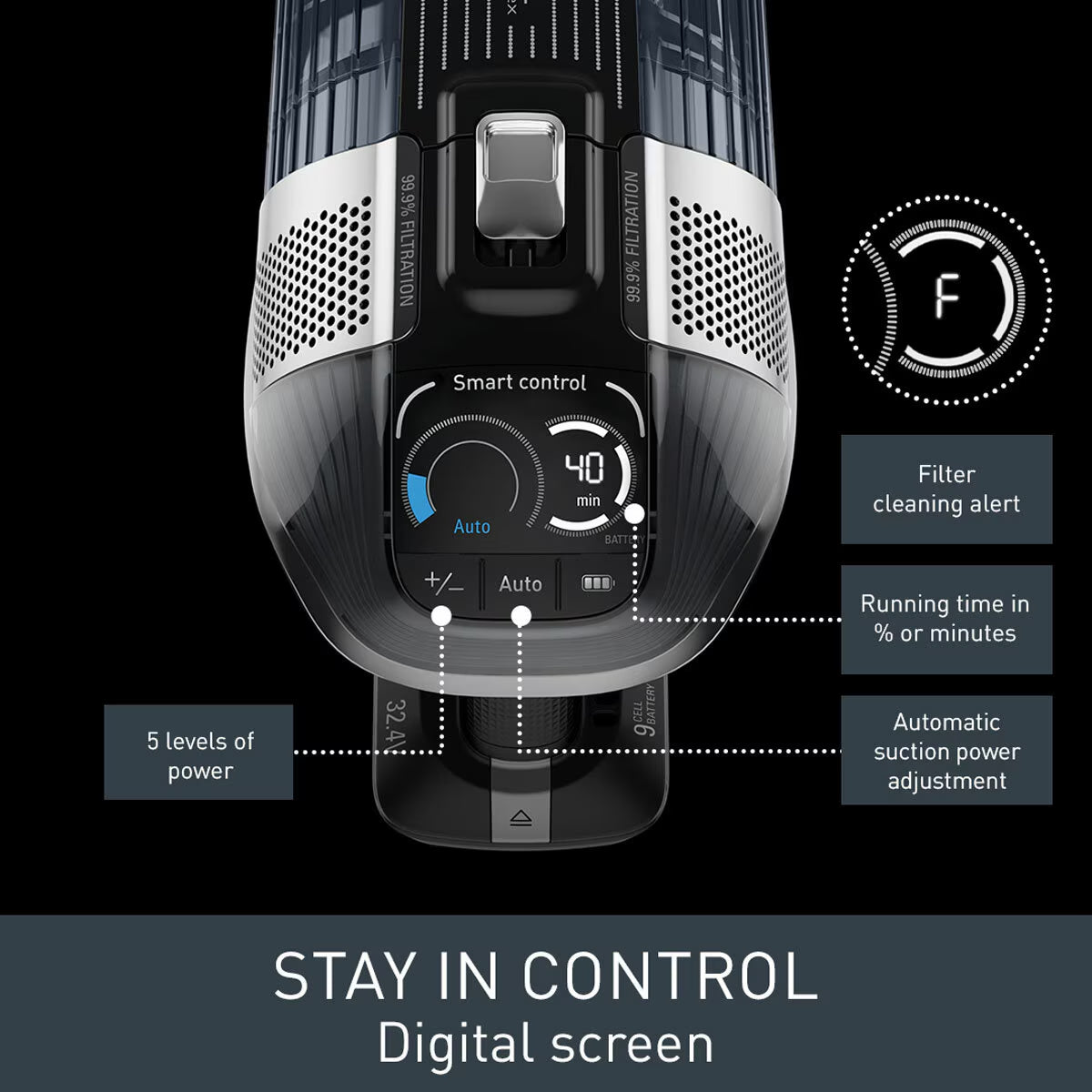 Cutting-edge technology including automatic suction power adjustment by floor type and Smart Control Display for remaining battery time, speed controls and more